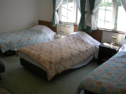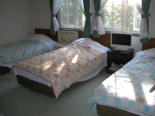 ペンション ティータイムは、標高1550mの夏でも爽やかな高原の女神湖の近くにあり、周辺に白樺等の木々のある宿。