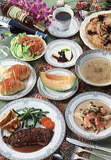 サラダ オードブル スープ メインのサーロインステーキ くだものデザート プチケーキ コーヒーか紅茶(大人の方のみ)