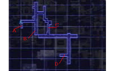 A:スタート地点 B:ガスランチャーがあるところ。 C:車の襲撃!バーにぶら下がるところ。 D:ゴール地点 |