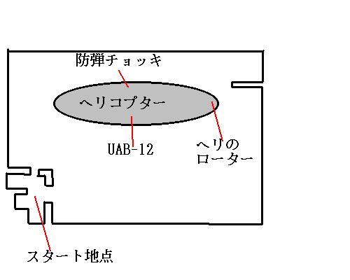 これは私のやり方ですが、まずスタートしたら、すぐ右に移動し建物の外に出ます。出たらすぐにヘリの頭側から防弾チョッキを取りに行きます。この間ダメージを受けたなら、取っときます。次は、うまくおびき寄せておいたら、反対側のUAB-12を取ります(これがないとこせません!)。ゲットしたら、ヘリのローターの後ろ当たりに陣取ります。自分、敵、ローターが一直線に並んだらひたすらぶっ放します。多分このようなかんじでいけると思います。