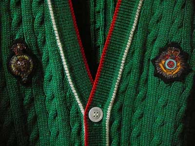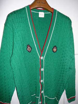 | クリスマス・カラーのウールの縄編みカーディガン。ワンダフルハウスは毎年12月に1〜2回だけ着て、クリスマスが過ぎると、さっさと仕舞ってしまいます。色は右の写真の方が近いです。カールヘルムでは、この形のミニ・エンブレムは、1986年秋に初登場して、ジャケットやジャンパーやニットに多用されましたが、このシーズン(1987年秋)を最後に使われなくなりました。英国の軍隊の正式なエンブレムを、そのままの形で縮小したものです。造りが丁寧で、小さくても高級感がありますね。 | |